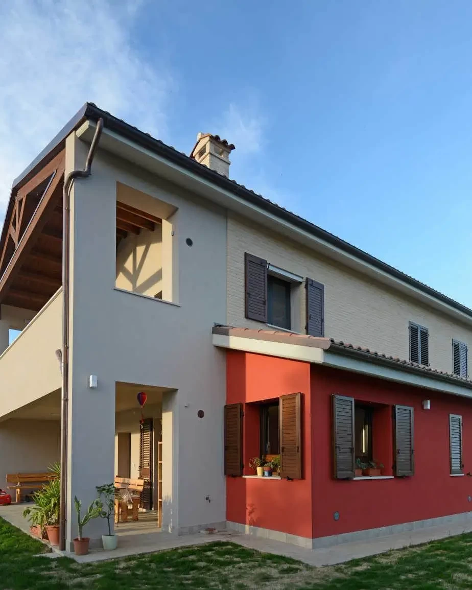 Realizzazione di villetta bifamiliare con struttura in cemento armato e blocco termico da 41cm. Tutti i materiali scelti per la realizzazione sono bio, forniti e pensati in collaborazione con la ditta Fassa Bortolo.